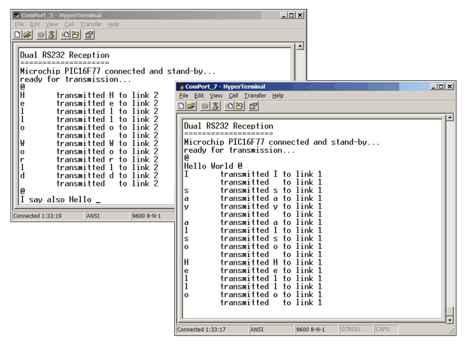 Two independent RS232 interfaces, with display of received ASCII characters and corresponding decimal values on the dot matrix LCD. ASCII values entered on one terminal window are transmitted by the first RS232 link to the controller, displayed on the LCD, and further transmitted across the second RS232 link to the other terminal window. The microcontroller sends feedback of received characters back to the issueing terminal window. When the PIC terminal is idle, it sends a status message '@' to both terminals every 2.75 seconds.