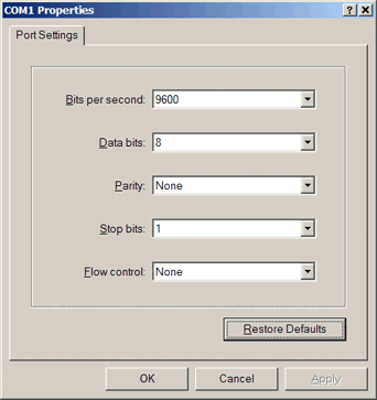 computer). The HyperTerminal program (Win9x, WinXP) is configured