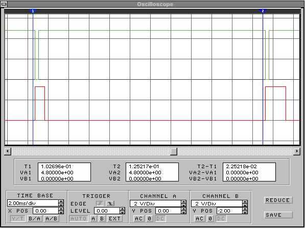 The two markers are 22.5 ms apart (T2-T1), the first pulse