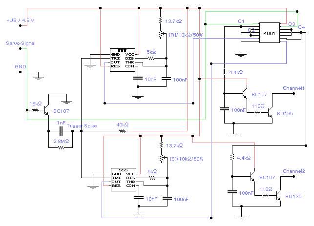 Each of them compares the fix signal from the 555's to the actual servo signal.