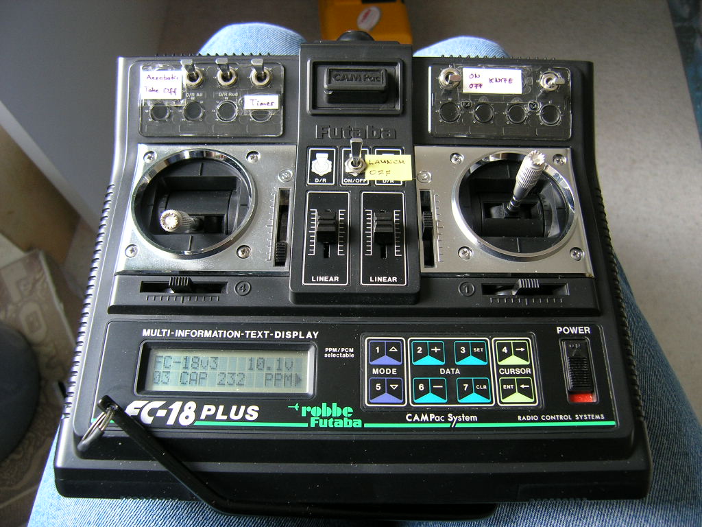 This is my radio: a good old Futaba FC18v3 Plus, with self-made