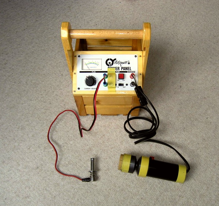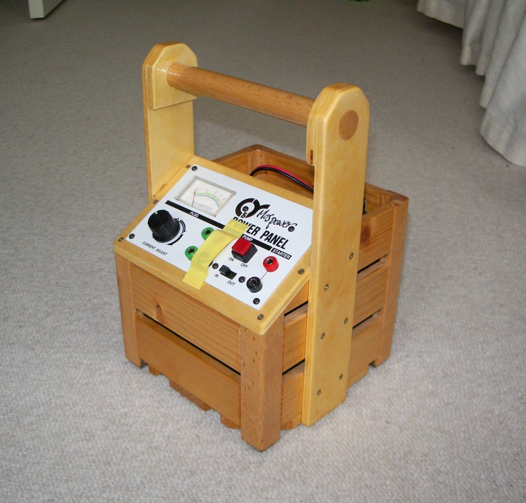 Wooden box, power-panel, 12V/7Ah lead accu, ordinary glow-plug,