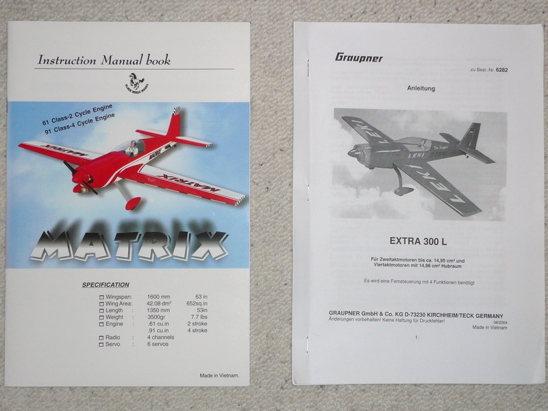 | Description: | Both ARF aircraft models are manufactured by Black Horse Model in Vietnam, and are identical in construction and realization. Wing and fuselage are completely built from wood. While the genuine Black Horse Extra 300L "Matrix" has a two-color trim scheme, the Graupner Extra 300L "Leki" is entirely covered in red. The main difference between both model kits are slightly higher-quality small parts shipped with the Graupner kit, e.g., screws and control horns. Note that the Graupner "Leki" is no longer manufactured. |