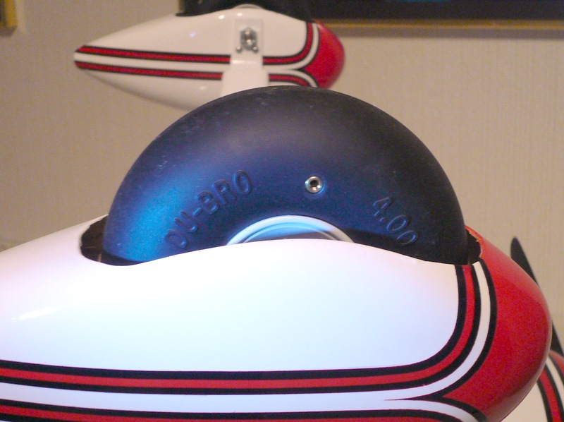 clarity. ii) Installed elevator and rudder metal-gear servos to the front, throttle servo to the back of the servo tray. See picture below for clarity. iii) Replaced the supplied light-weight plastic wheels with low-bounce Dubro 4" unthreaded inflatable rubber wheels. See picture below for clarity. iv) Mounted the engine 45 degrees hanging in order to get muffler protruding vertically between the gear legs. See picture below for clarity. v) Installed O.S. remote glow extension for convenient engine start procedure. See picture below for clarity. vi) Rotated lower aileron nylon control horns connecting the lower and upper wing ailerons using connecting rods in order to get increased swing of lower ailerons without getting limited by the top ailerons. See picture below for clarity. vii) Installed all aluminum push-rod tubes of the dummy radial engine to preserve the visual nature of the 9 cylinder radial engine. See picture below for clarity. |